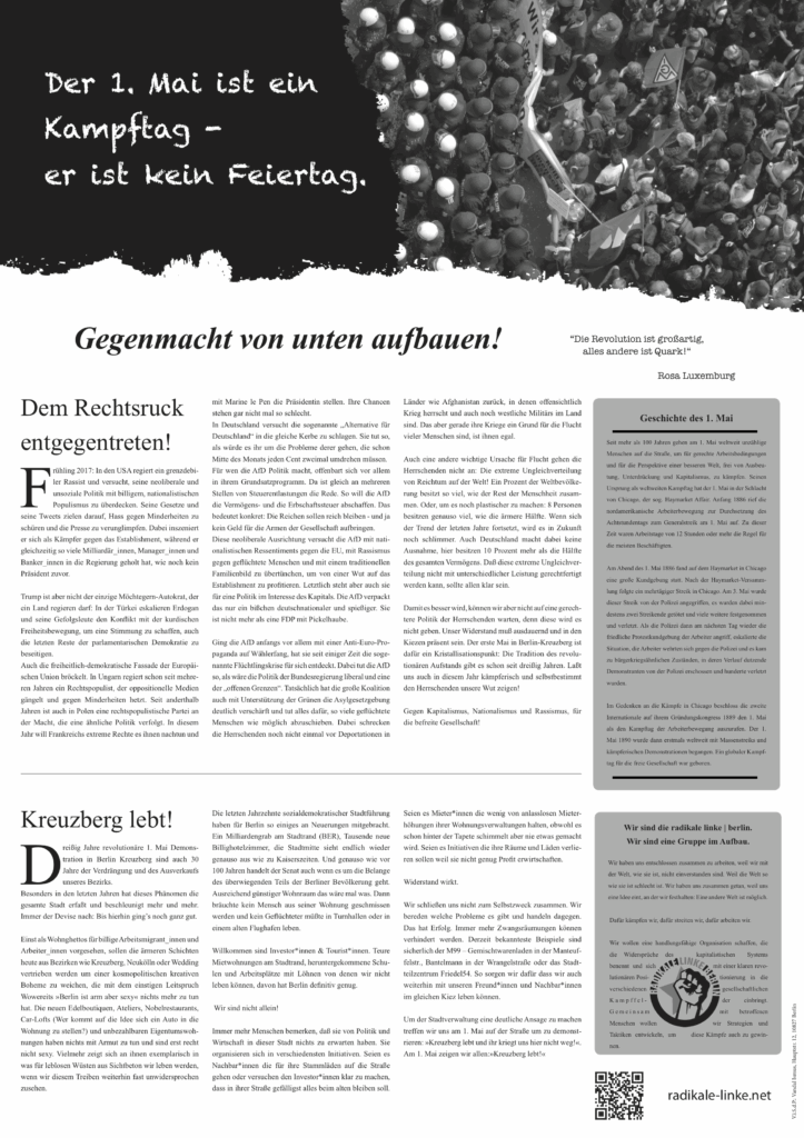 Zum 30. Mal jährt sich der Revolutionäre 1. Mai in Berlin. Die Verhältnisse, in denen wir leben, lassen uns kaum noch Luft zum Atmen. In den Parlamenten und auf der Straße erleben wir einen Rechtsruck, gleichzeitig steigen die Mieten und unsere Nachbar_innen und Sozialen Zentren sind von Zwangsräumungen bedroht. Diese Probleme werden nicht durch die Parlamente gelöst, vor Verdrängung und dem Nazipack schützt uns nicht die Staatsmacht. Diese ist viel mehr Erfüllungsgehilfe der Investoren und der Herrschenden.