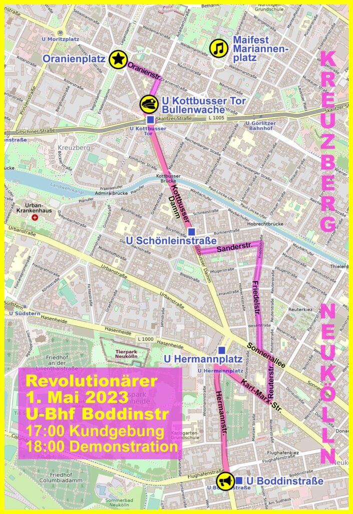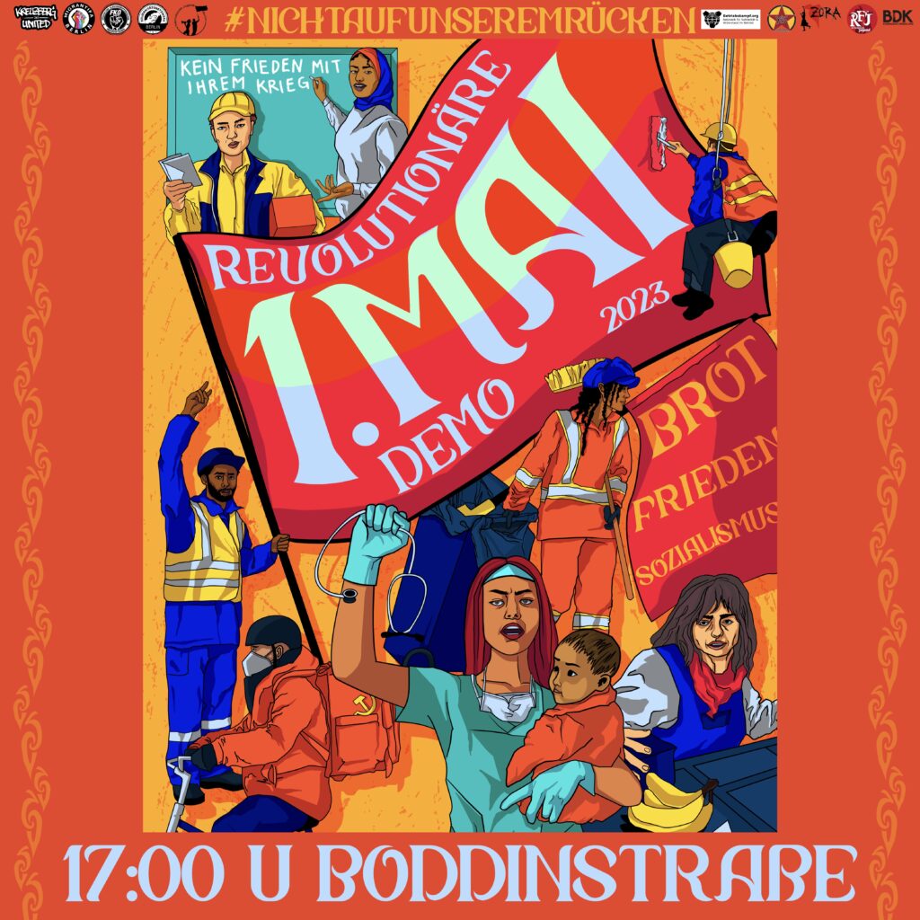 Wir wollen am 1. Mai 2022 gemeinsam am Hertzbergplatz starten und gemeinsam am Oranienplatz-Platz ankommen. Das ist unsere klare Ansage. Die Springer-Presse hetzt gegen den Anmelder der Demo und verbreitet Lügen und Verleumdungen! Wir solidarisieren uns mit ihm gegen die Angriffe! Hier findet ihr ein gutes Statement der Roten Hilfe Berlin dazu: Zur Diffamierungskampagne gegen die Revolutionäre 1. Mai Demo